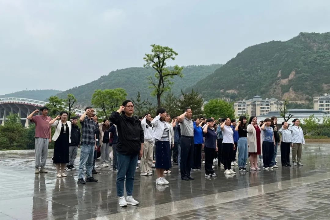 第一站是宝塔山。宝塔山是革命圣地延安的重要标志和象征。巍巍宝塔山,见证了中国共产党从胜利走向新的胜利的光辉历史;滚滚延河水,映射出中国共产党人的初心和使命。在这里,同志们聆听党课《宝塔山连着天安门》,诵读贺敬之《回延安》,唱响《黄河大合唱》,重温入党誓词,重走革命征途,探寻革命精神。蒙蒙细雨,既清新了空气,也温润着同志们的赤诚之心。